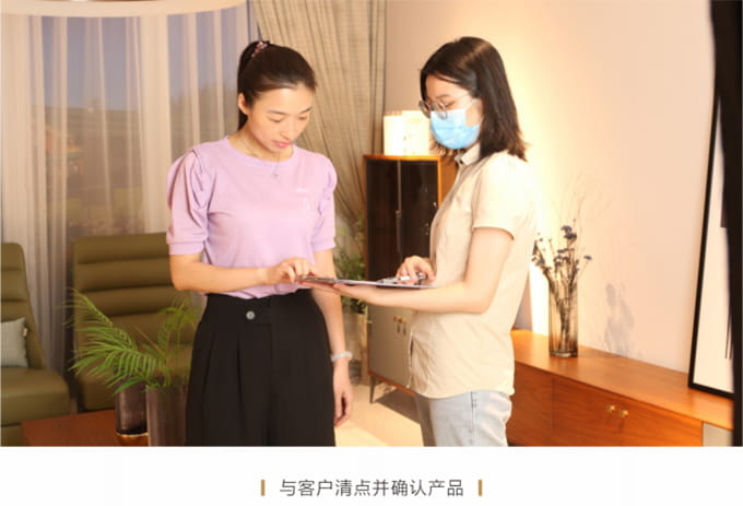 安装并检查完所有工作后,需与客户清点并确认产品,将所有带电源的家具插上电源,告知客户家具使用方法和功能及保养知识、注意事项等。所有带功能的产品需演示给客户看。例: