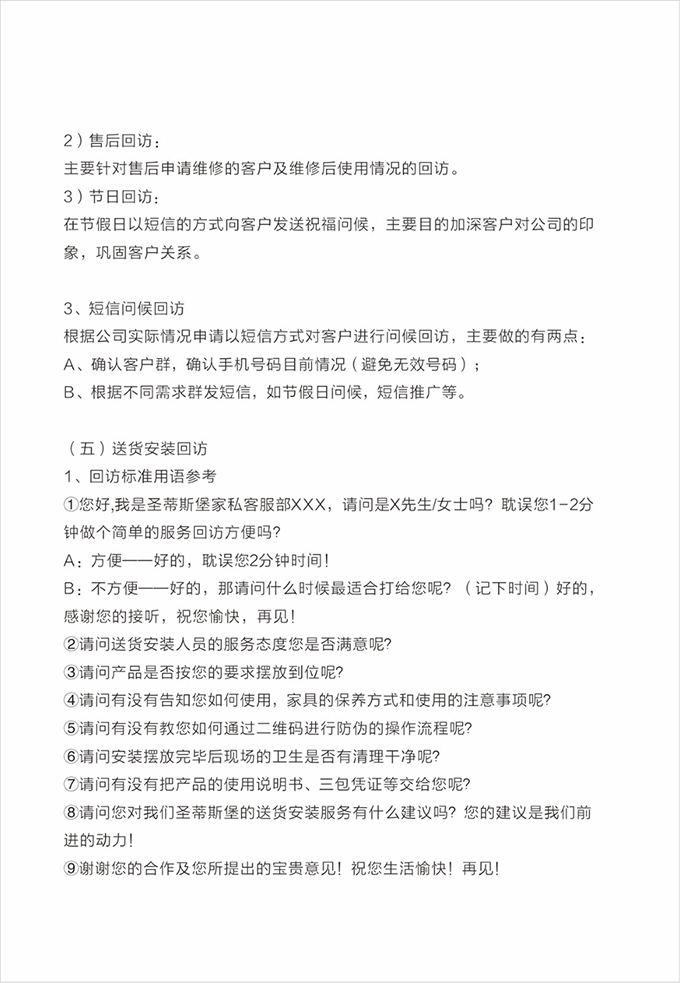 话术参考:“**先生/女士您好,我是AG闲庄·的售后服务人员**,您购买的AG闲庄·家具已经全部到货了,送货安装大约需要**时间,请问您这边什么时候方便我们上门送货安装呢?”同时要了解送货小区的电梯、楼道、入户门的尺寸等,提前做好准备,避免意外情况。最后确定送货时间(安装所需要时长),并告知客户安装人员的相关信息,可加微信发送,并发送配送安装流程说明。